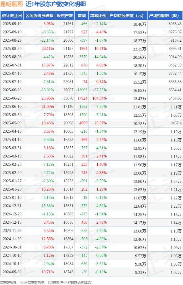 从股价来看,2025年9月10日至2025年9月19日,易明医药区间涨幅为3.05%,在此期间股东户数减少466.0户,减幅为2.14%。