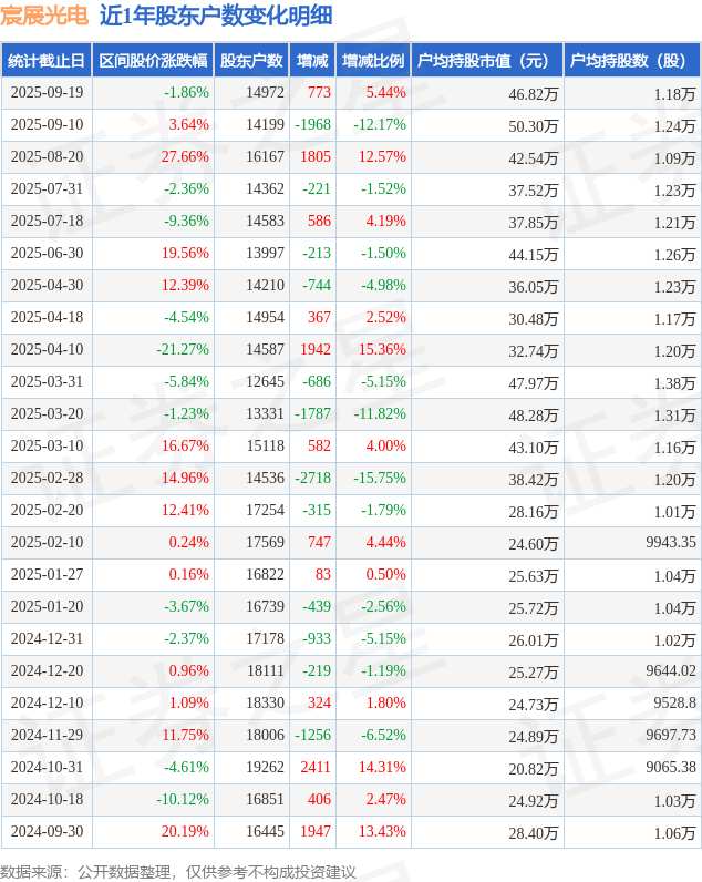 从股价来看,2025年9月10日至2025年9月19日,宸展光电区间跌幅为1.86%,在此期间股东户数增加773.0户,增幅为5.44%。