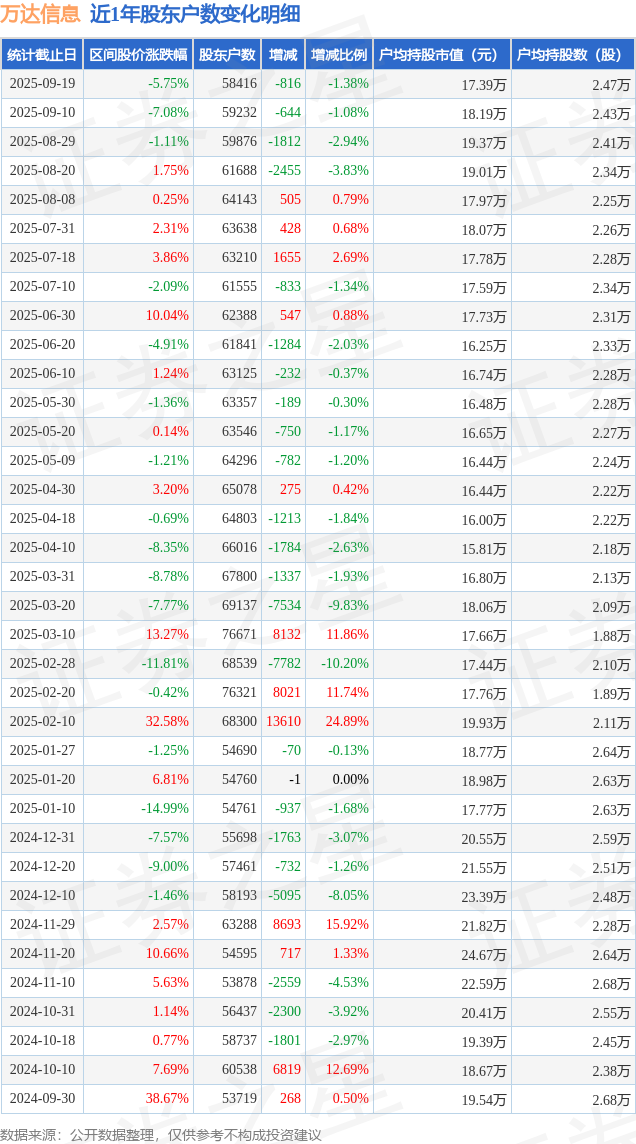 从股价来看,2025年9月10日至2025年9月19日,万达信息区间跌幅为5.75%,在此期间股东户数减少816.0户,减幅为1.38%。