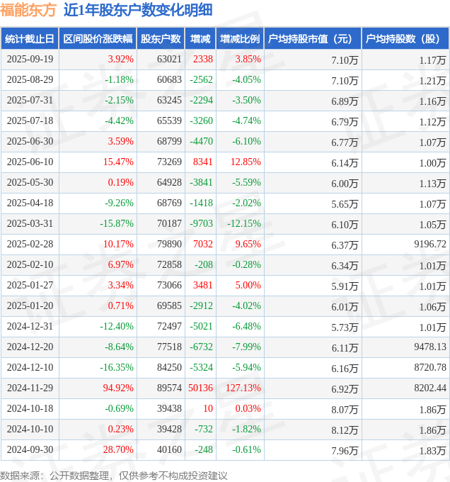 从股价来看,2025年8月29日至2025年9月19日,福能东方区间涨幅为3.92%,在此期间股东户数增加2338.0户,增幅为3.85%。