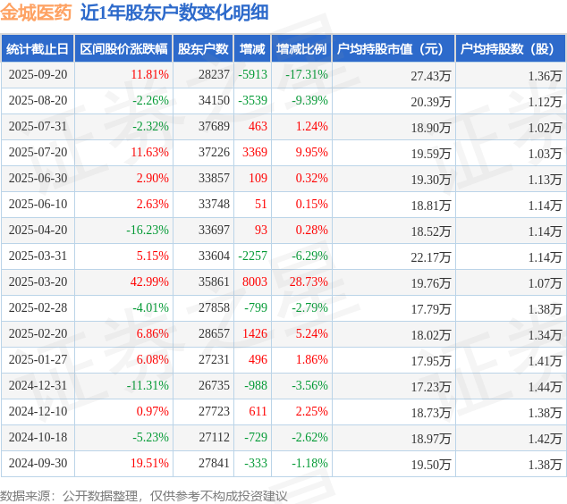从股价来看,2025年8月20日至2025年9月20日,金城医药区间涨幅为11.81%,在此期间股东户数减少5913.0户,减幅为17.31%。