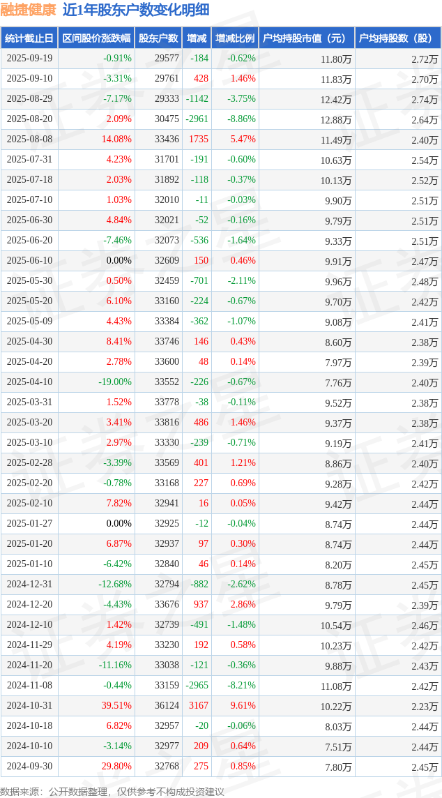 从股价来看,2025年9月10日至2025年9月19日,融捷健康区间跌幅为0.91%,在此期间股东户数减少184.0户,减幅为0.62%。