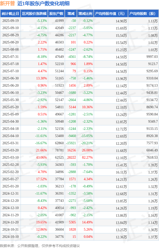从股价来看,2025年9月10日至2025年9月19日,新开普区间跌幅为5.13%,在此期间股东户数减少50.0户,减幅为0.12%。
