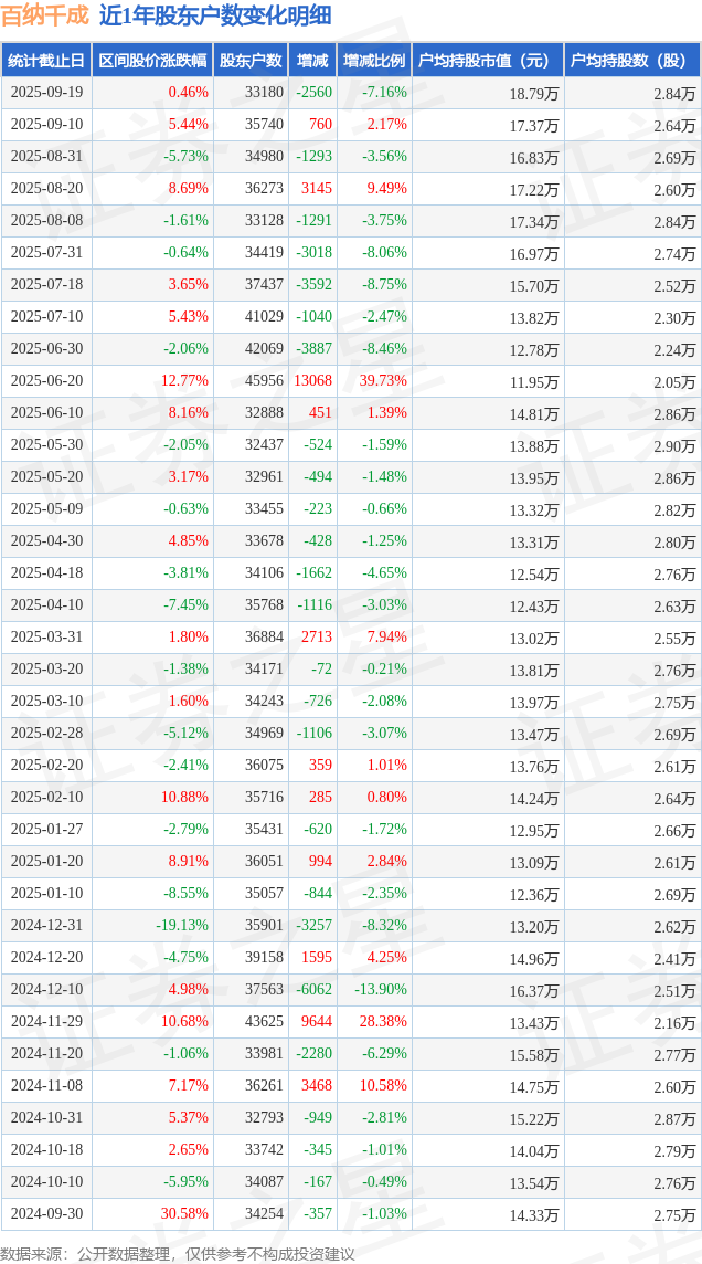 从股价来看,2025年9月10日至2025年9月19日,百纳千成区间涨幅为0.46%,在此期间股东户数减少2560.0户,减幅为7.16%。