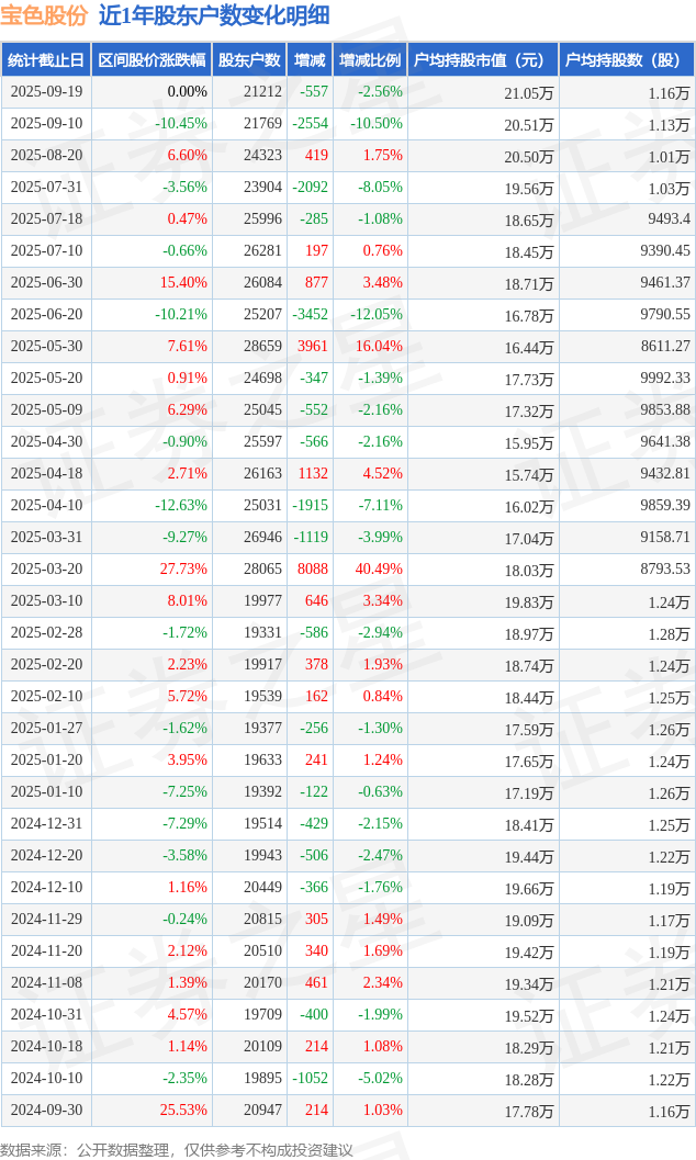 从股价来看,2025年9月10日至2025年9月19日,宝色股份区间跌幅为0.0%,在此期间股东户数减少557.0户,减幅为2.56%。