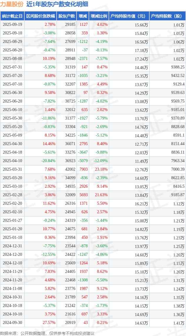 从股价来看,2025年9月10日至2025年9月19日,力星股份区间涨幅为2.78%,在此期间股东户数增加1127.0户,增幅为4.02%。