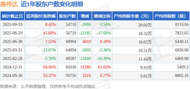 从股价来看,2025年8月29日至2025年9月19日,高伟达区间涨幅为8.45%,在此期间股东户数减少2009.0户,减幅为3.54%。