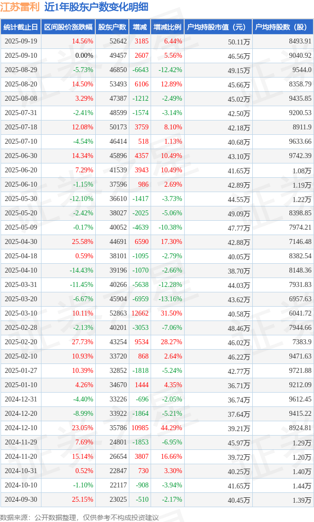 从股价来看,2025年9月10日至2025年9月19日,江苏雷利区间涨幅为14.56%,在此期间股东户数增加3185.0户,增幅为6.44%。