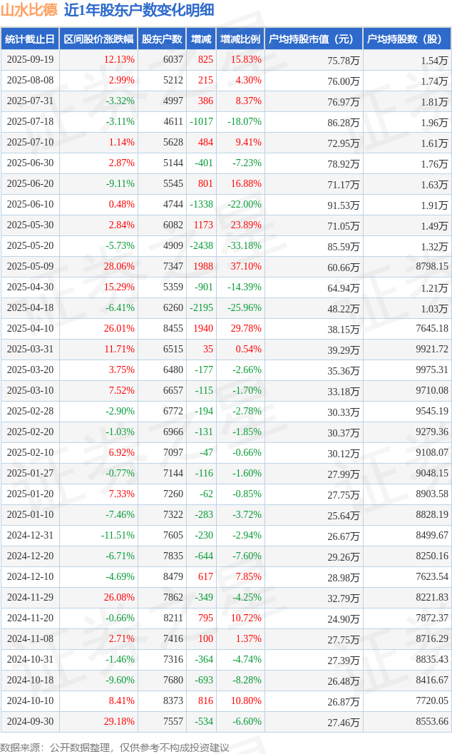证券之星消息,近日山水比德披露,截至2025年9月19日公司股东户数为6037.0户,较8月8日增加825.0户,增幅为15.83%。户均持股数量由上期的1.74万股减少至1.54万股,户均持股市值为75.78万元。