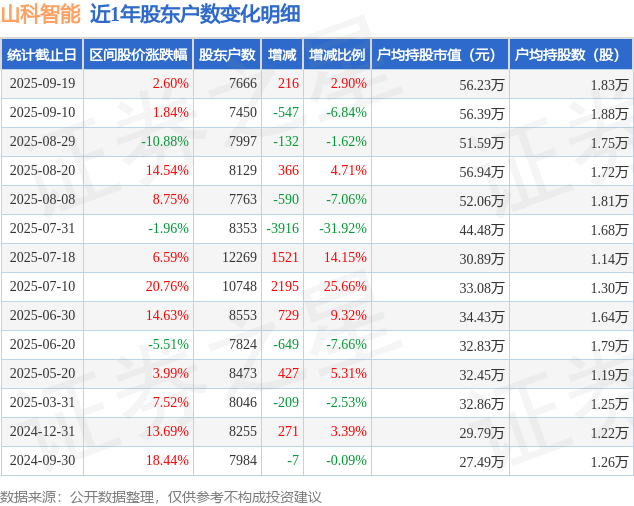 从股价来看,2025年9月10日至2025年9月19日,山科智能区间涨幅为2.6%,在此期间股东户数增加216.0户,增幅为2.9%。