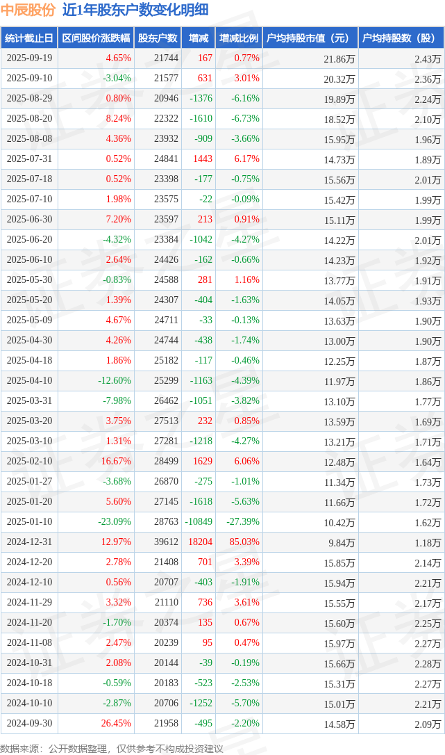 从股价来看,2025年9月10日至2025年9月19日,中辰股份区间涨幅为4.65%,在此期间股东户数增加167.0户,增幅为0.77%。