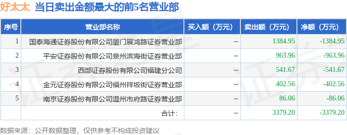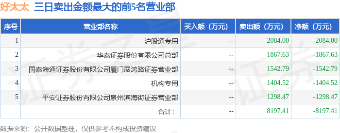 证券之星消息,沪深交易所2025年9月24日公布的交易公开信息显示,好太太(603848)因有价格涨跌幅限制的日收盘价格跌幅偏离值达到7%的前五只证券,非ST、*ST和S证券连续三个交易日内收盘价格跌幅偏离值累计达到20%的证券登上龙虎榜。此次是近5个交易日内第3次上榜。