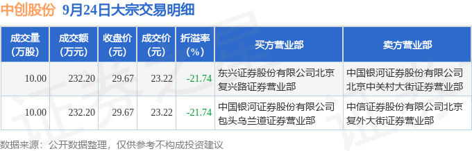 证券之星消息,9月24日中创股份发生大宗交易,交易数据如下: