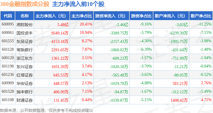 资金流向方面,380金融(000110)指数成份股当日主力资金净流入合计5.33亿元,游资资金净流出合计3.44亿元,散户资金净流出合计1.88亿元。成份股资金流向详情见下表: