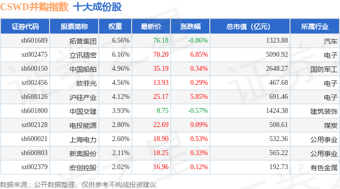 CSWD并购(399992)指数十大成份股详情如下: