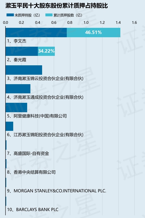 截止本公告日,股东李文杰已累计质押股份6631.0万股,占其持股总数的46.51%,股东秦光霞已累计质押股份2100.0万股,占其持股总数的34.22%。本次质押后漱玉平民十大股东的累计质押股份占持股比例(占持股比例的计算以公司最新一期财务报表公布的十大股东的持股总数为基准)见下图:
