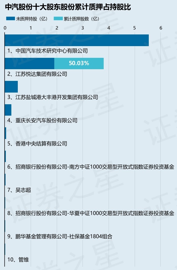 截止本公告日,股东江苏悦达集团有限公司已累计质押股份1.91亿股,占其持股总数的50.03%。本次质押后中汽股份十大股东的累计质押股份占持股比例(占持股比例的计算以公司最新一期财务报表公布的十大股东的持股总数为基准)见下图: