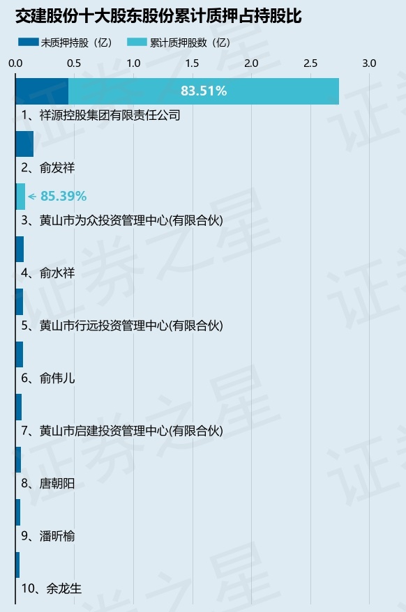 截止本公告日,股东祥源控股集团有限责任公司已累计质押股份2.29亿股,占其持股总数的83.51%,股东黄山市为众投资管理中心(有限合伙)已累计质押股份742.0万股,占其持股总数的85.39%。本次质押后交建股份十大股东的累计质押股份占持股比例(占持股比例的计算以公司最新一期财务报表公布的十大股东的持股总数为基准)见下图: