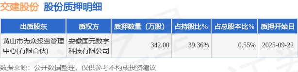 证券之星消息,交建股份(603815)9月24日公开信息显示,股东黄山市为众投资管理中心(有限合伙)向安徽国元数字科技有限公司合计质押342.0万股,占总股本0.55%。质押详情见下表: