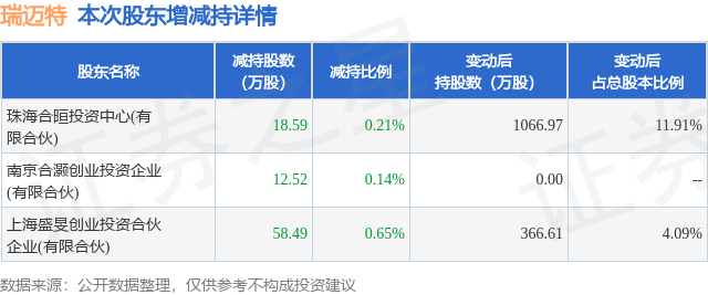 证券之星消息,9月24日瑞迈特发布公告《瑞迈特:关于持股5%以上股东及其一致行动人减持股份触及1%整数倍的公告》,其股东珠海合晅投资中心(有限合伙)、南京合灏创业投资企业(有限合伙)、上海盛旻创业投资合伙企业(有限合伙)于2025年8月12日至2025年9月24日间合计减持89.6万股,占公司目前总股本的1.0%,变动期间该股股价下跌7.42%,截止9月24日收盘报84.89元。
