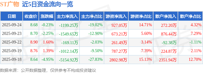 证券之星消息,截至2025年9月24日收盘,ST广物(600603)报收于8.68元,下跌0.23%,换手率0.61%,成交量7.23万手,成交额6304.1万元。