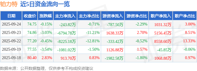 证券之星消息,截至2025年9月24日收盘,铂力特(688333)报收于74.75元,下跌0.15%,换手率1.69%,成交量4.63万手,成交额3.44亿元。