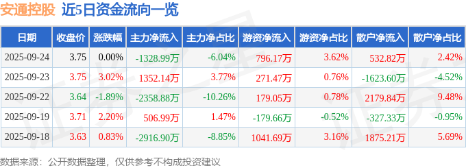证券之星消息,截至2025年9月24日收盘,安通控股(600179)报收于3.75元,上涨0.0%,换手率1.58%,成交量59.16万手,成交额2.2亿元。