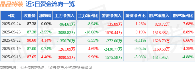 证券之星消息,截至2025年9月24日收盘,晶品特装(688084)报收于87.38元,上涨0.0%,换手率3.53%,成交量1.25万手,成交额1.08亿元。