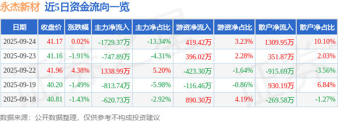证券之星消息,截至2025年9月24日收盘,永杰新材(603271)报收于41.17元,上涨0.02%,换手率8.05%,成交量3.17万手,成交额1.3亿元。