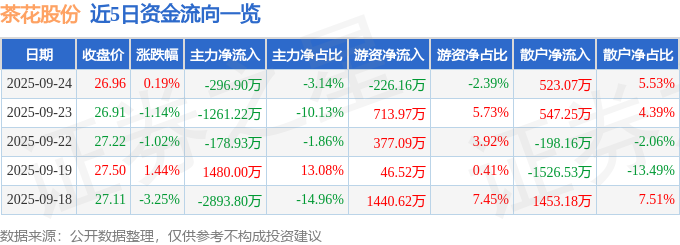 证券之星消息,截至2025年9月24日收盘,茶花股份(603615)报收于26.96元,上涨0.19%,换手率1.45%,成交量3.51万手,成交额9458.36万元。