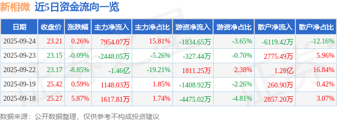 证券之星消息,截至2025年9月24日收盘,新相微(688593)报收于23.21元,上涨0.26%,换手率6.71%,成交量21.64万手,成交额5.03亿元。