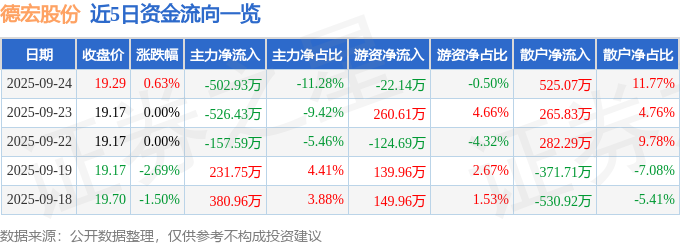 证券之星消息,截至2025年9月24日收盘,德宏股份(603701)报收于19.29元,上涨0.63%,换手率0.89%,成交量2.32万手,成交额4459.41万元。