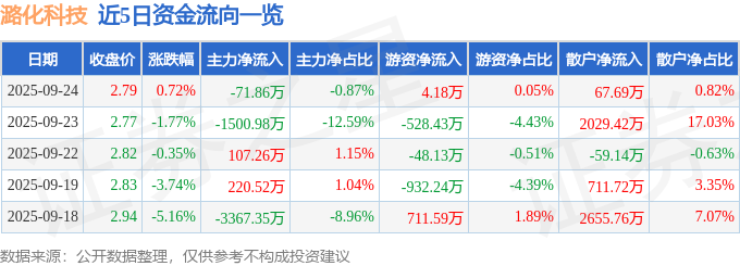 9月24日的资金流向数据方面,主力资金净流出71.86万元,占总成交额0.87%,游资资金净流入4.18万元,占总成交额0.05%,散户资金净流入67.69万元,占总成交额0.82%。