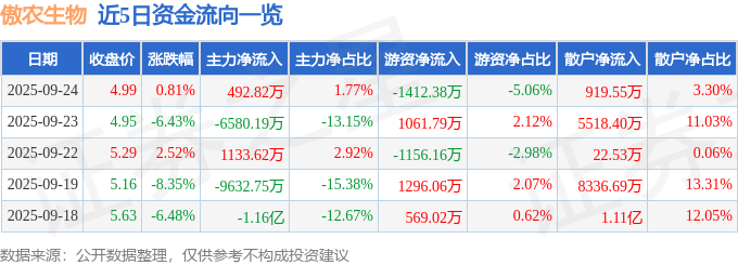 证券之星消息,截至2025年9月24日收盘,傲农生物(603363)报收于4.99元,上涨0.81%,换手率3.52%,成交量56.26万手,成交额2.79亿元。
