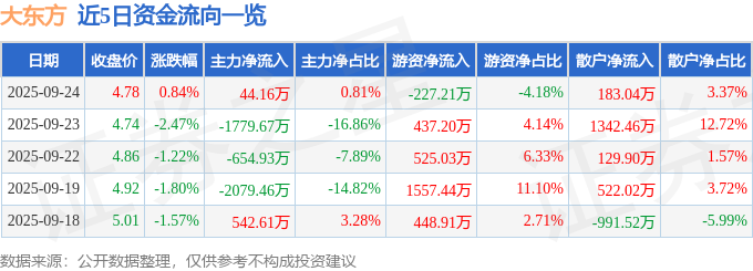 证券之星消息,截至2025年9月24日收盘,大东方(600327)报收于4.78元,上涨0.84%,换手率1.29%,成交量11.45万手,成交额5433.27万元。