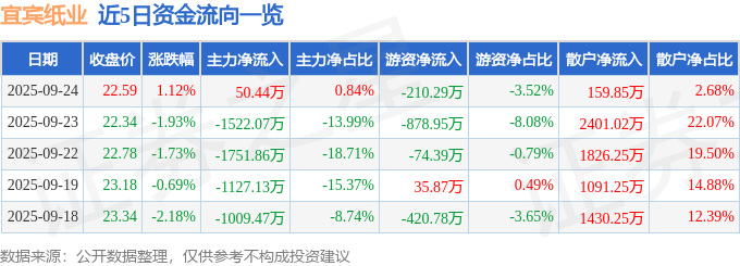 证券之星消息,截至2025年9月24日收盘,宜宾纸业(600793)报收于22.59元,上涨1.12%,换手率1.5%,成交量2.65万手,成交额5971.45万元。
