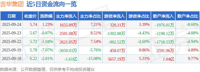 证券之星消息,截至2025年9月24日收盘,吉华集团(603980)报收于5.74元,上涨1.23%,换手率5.96%,成交量40.31万手,成交额2.3亿元。