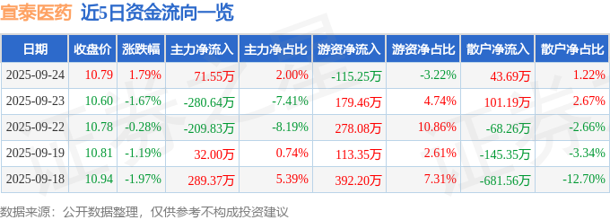 证券之星消息,截至2025年9月24日收盘,宣泰医药(688247)报收于10.79元,上涨1.79%,换手率0.74%,成交量3.34万手,成交额3578.84万元。
