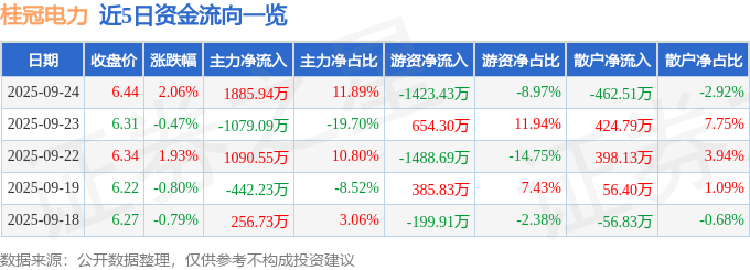 证券之星消息,截至2025年9月24日收盘,桂冠电力(600236)报收于6.44元,上涨2.06%,换手率0.31%,成交量24.66万手,成交额1.59亿元。
