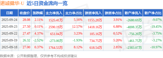 证券之星消息,截至2025年9月24日收盘,诺诚健华(688428)报收于28.08元,上涨2.11%,换手率3.92%,成交量10.53万手,成交额2.95亿元。
