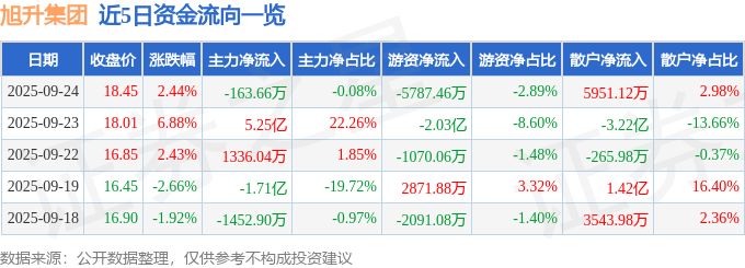 证券之星消息,截至2025年9月24日收盘,旭升集团(603305)报收于18.45元,上涨2.44%,换手率11.5%,成交量109.63万手,成交额20.0亿元。