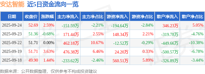 证券之星消息,截至2025年9月24日收盘,安达智能(688125)报收于52.69元,上涨2.59%,换手率5.75%,成交量1.31万手,成交额6855.13万元。