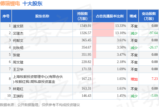根据德瑞锂电2025年中报公布的十大股东详情如下: