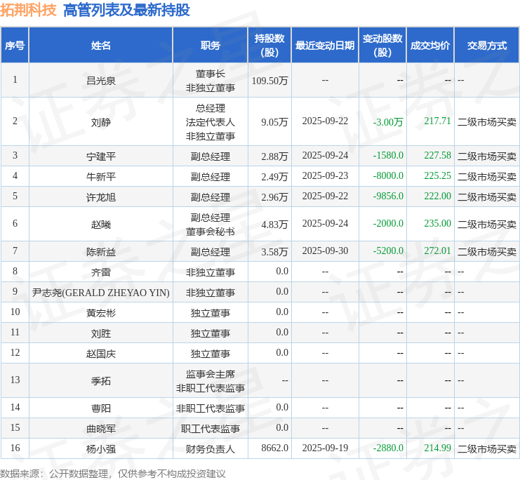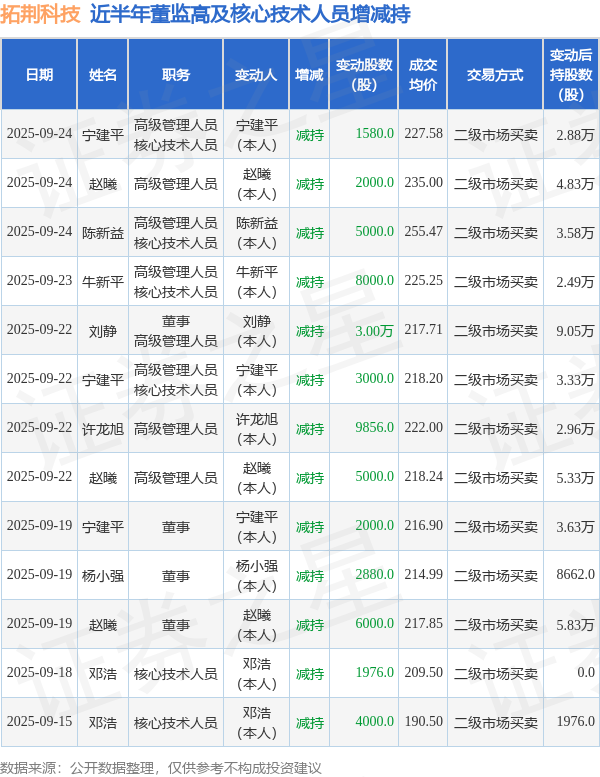 拓荆科技近半年内的董监高及核心技术人员增减持详情如下: