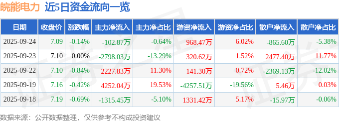 证券之星消息,截至2025年9月24日收盘,皖能电力(000543)报收于7.09元,下跌0.14%,换手率1.0%,成交量22.7万手,成交额1.61亿元。