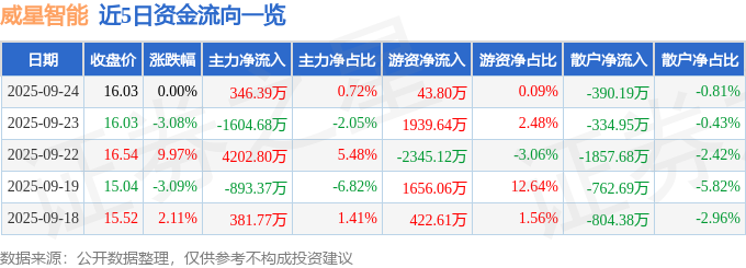 证券之星消息,截至2025年9月24日收盘,威星智能(002849)报收于16.03元,上涨0.0%,换手率15.48%,成交量29.97万手,成交额4.8亿元。
