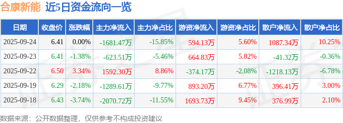 证券之星消息,截至2025年9月24日收盘,合康新能(300048)报收于6.41元,上涨0.0%,换手率1.48%,成交量16.6万手,成交额1.06亿元。