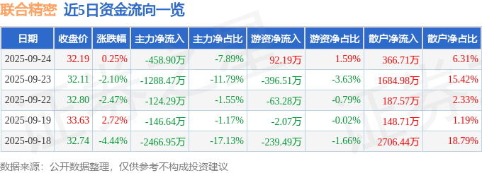 证券之星消息,截至2025年9月24日收盘,联合精密(001268)报收于32.19元,上涨0.25%,换手率2.89%,成交量1.82万手,成交额5815.05万元。