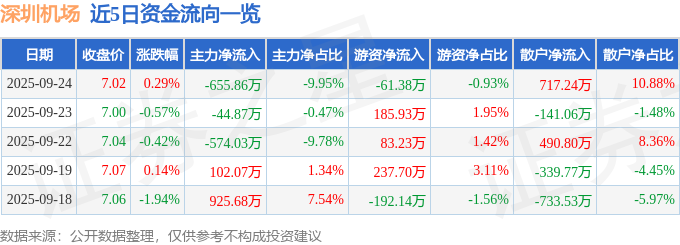 证券之星消息,截至2025年9月24日收盘,深圳机场(000089)报收于7.02元,上涨0.29%,换手率0.46%,成交量9.4万手,成交额6589.87万元。