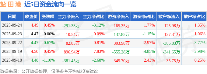 证券之星消息,截至2025年9月24日收盘,盐 田 港(000088)报收于4.49元,上涨0.45%,换手率0.66%,成交量20.82万手,成交额9325.24万元。